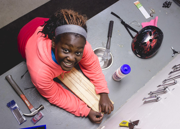 "I used to like to stay in the shadows but the CBC made me come out into the light and be myself," says Achayo Katanga, 11, who has discovered new friends and interests at the Community Bicycle Center in Biddeford.